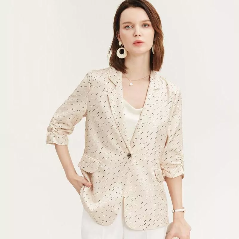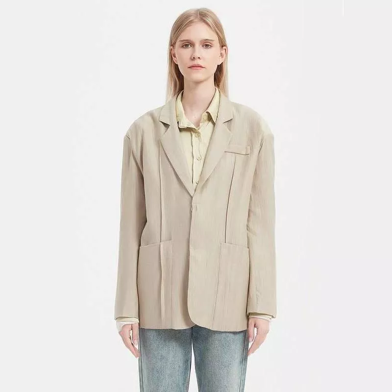 Women’s Solid Color Blazer with Notched Collar and Unique Folds