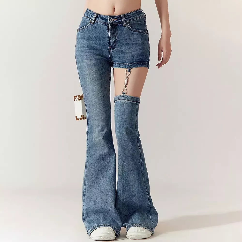 High Waist Hollow Out Chain Spliced Slim Flare Jeans