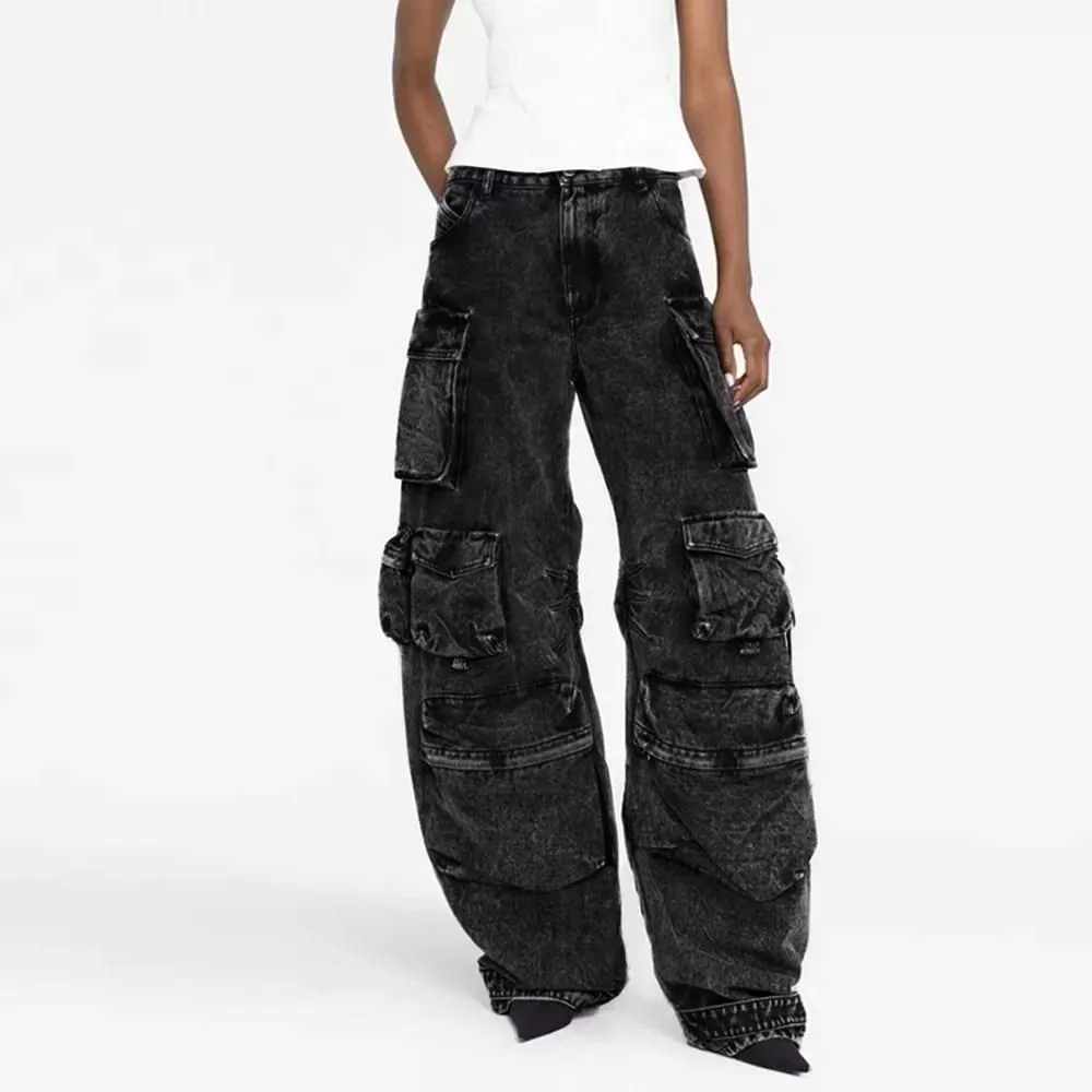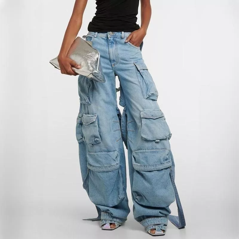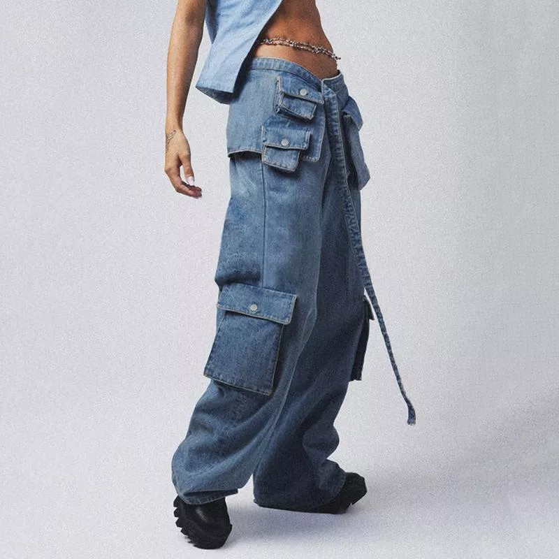 High-Waisted Baggy Jeans with Lace-Up Cargo Pockets