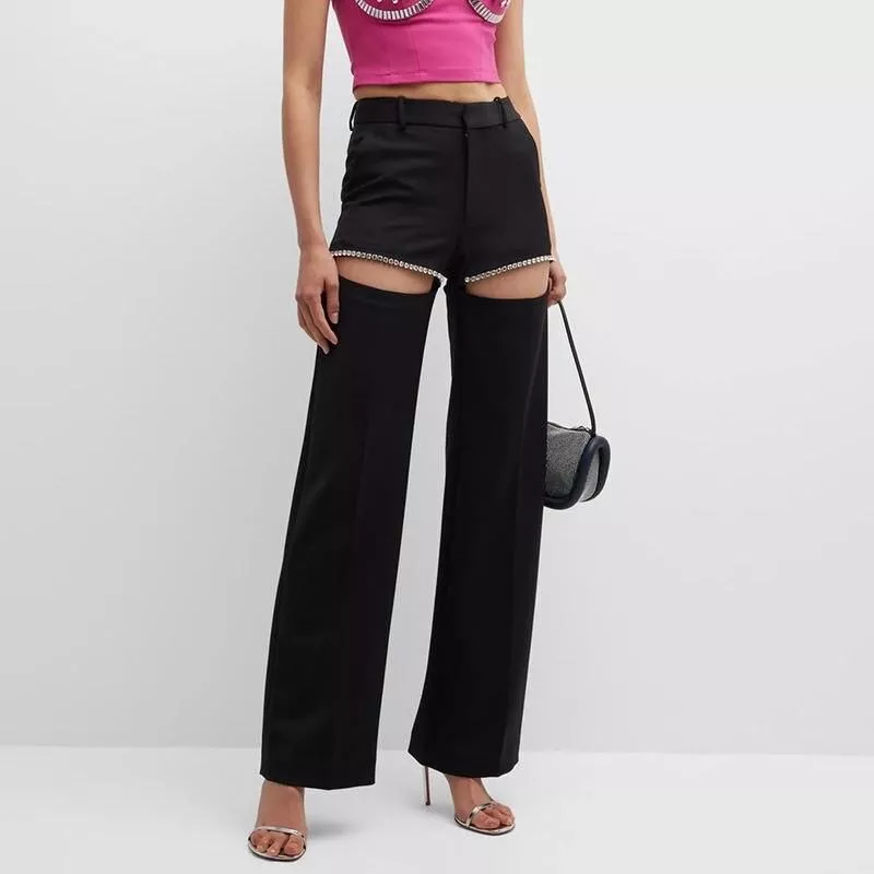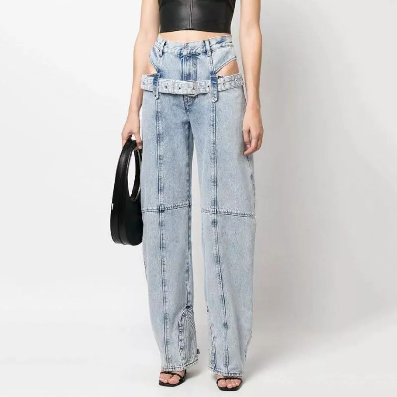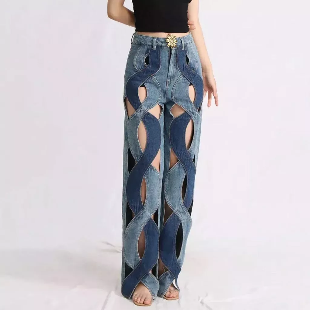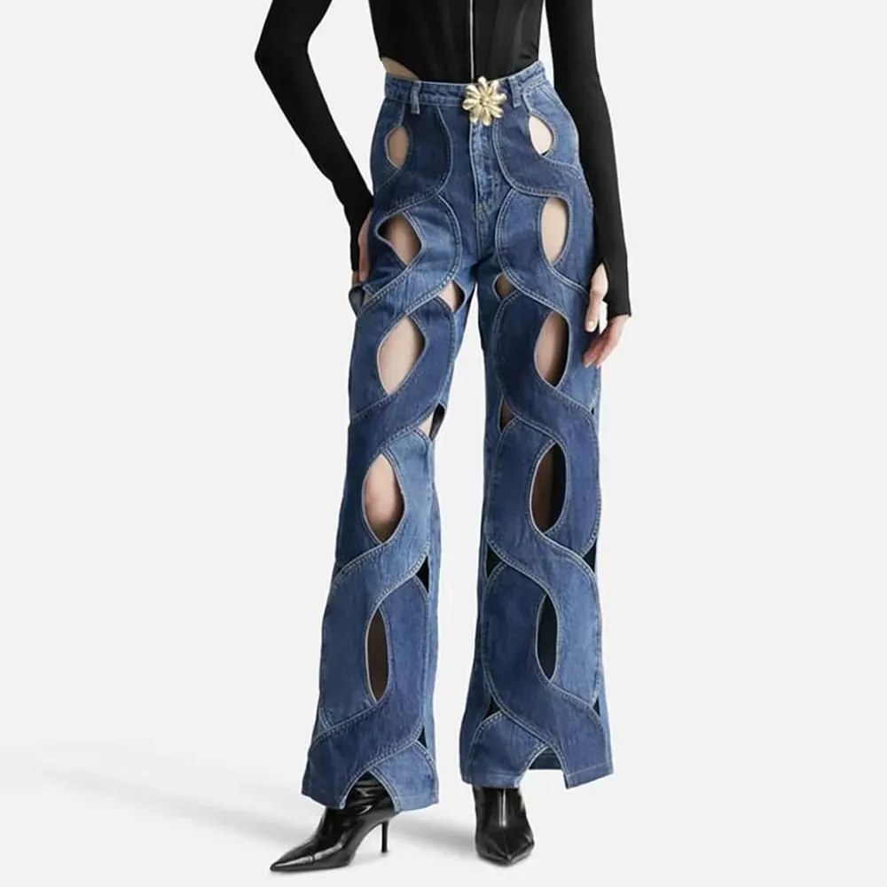 High Waist Casual Straight Denim Trousers with Hollow Out Detail
