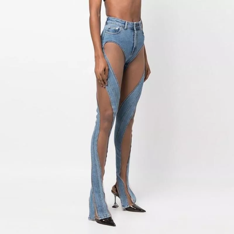 High Waist Sheer Mesh Patchwork Flare Denim Pants