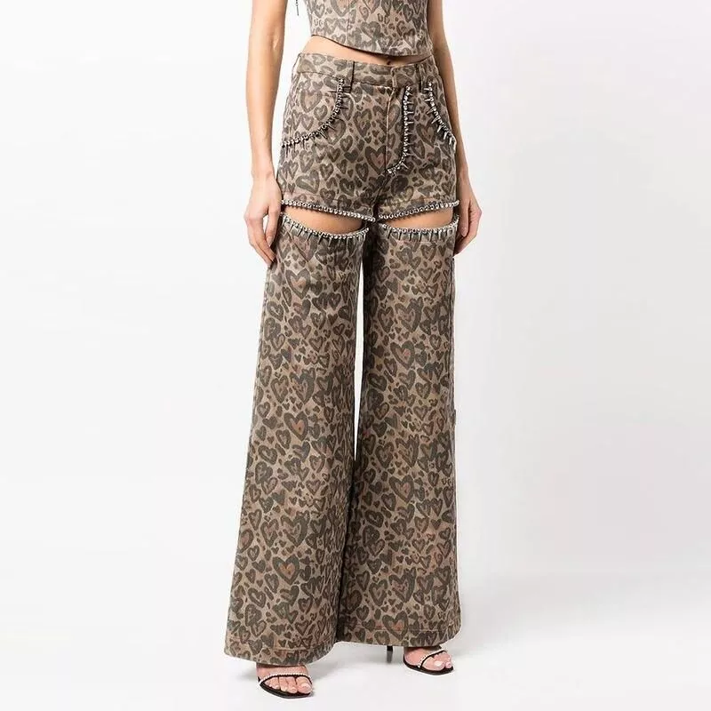 High Waist Patchwork Leopard Denim Trousers