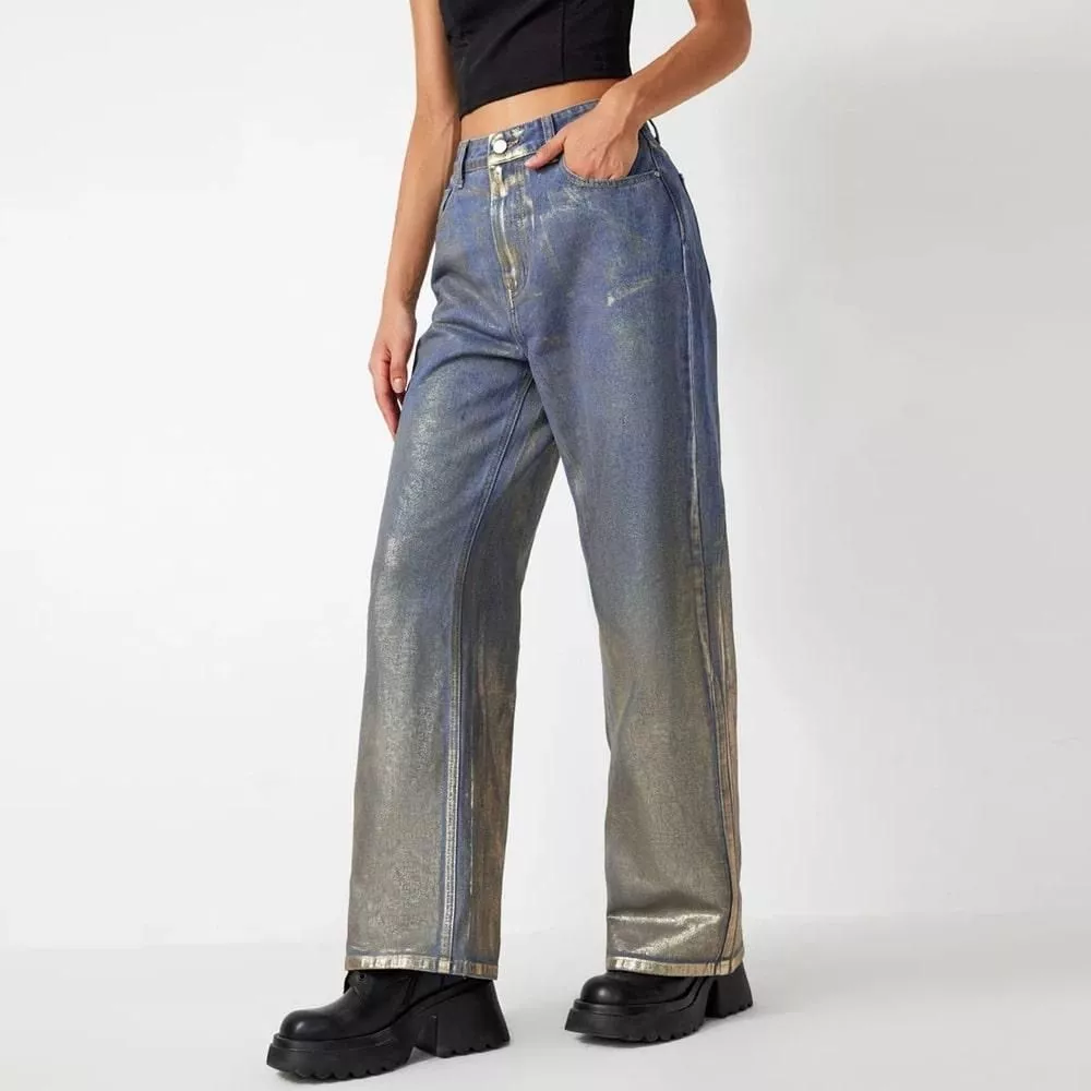 High Waist Gold Coated Straight Jeans