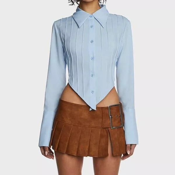 Our blouse boasts a unique V-shaped hem and an eye-catching lace-up back that adds a dash of intrigue to your outfit. Made with a blend of high-quality cotton and polyester, it offers both comfort and durability. The midweight fabric is perfect for all-season wear, providing the right balance of breathability and warmth. With a regular clothing length and a slim-fit design, it hugs your figure in all the right places, accentuating your silhouette.