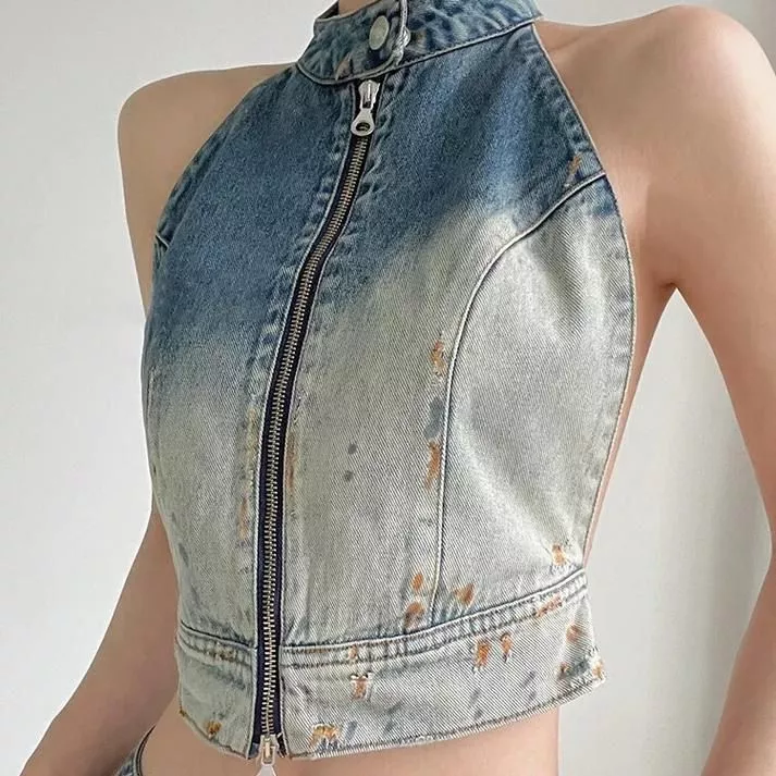Summer Fashion Sexy V-Neck Patchwork Diamond Zipper Tank Top