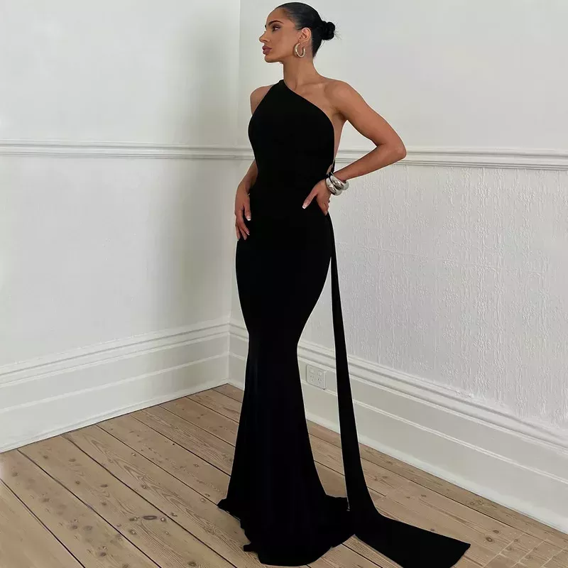 Chic Oblique Shoulder Thigh-High Split Maxi Dress – Sleeveless Backless Bodycon for Evening Parties