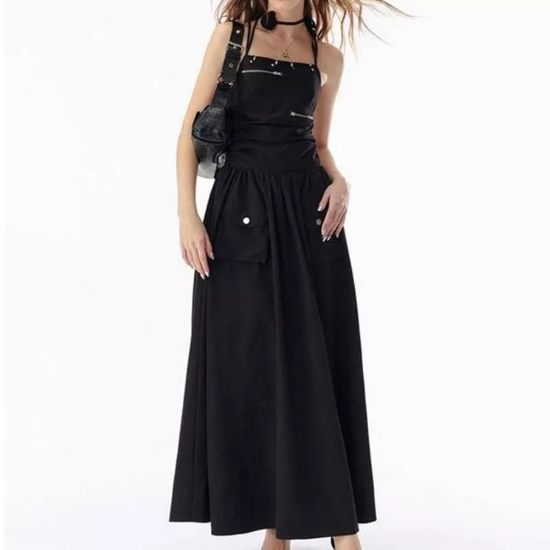 Elegant Basic Solid Black Backless Bandage Maxi Dress with Pockets