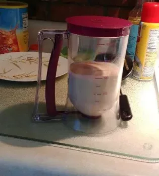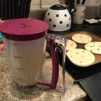 During a visit to my cousins, they were making pancakes for breakfast using a similar pancake dispenser that required squeezing the container to release the batter. Given my small hands, I would have had to use both hands. That's when I decided to search on Amazon and found this one. Although it cost a bit more, the convenience of squeezing the handle to dispense the batter made it worth every penny. It outperforms my old method of using a 1/4 cup and spatula every time!