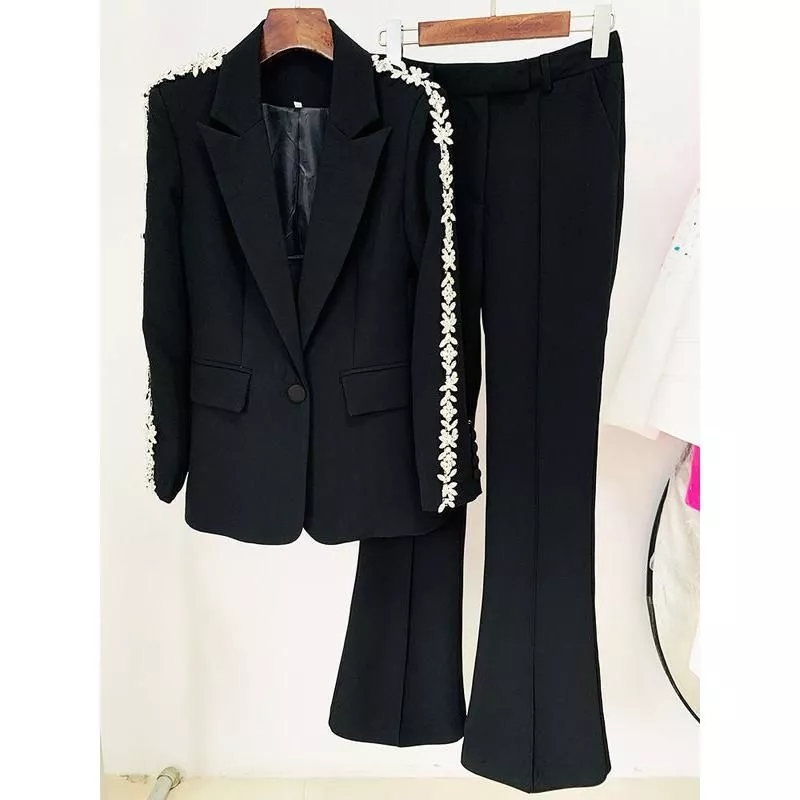 Step into a world of elegance with our newest 2024 runway-inspired women’s suit set. Meticulously crafted for the modern, career-oriented woman, this set features a single diamond beaded blazer paired with chic flare pants. It’s a fashion statement that transcends the ordinary, blending sophistication with a touch of glamour. Ideal for both office and high-street fashion, it’s designed to elevate your style quotient effortlessly.