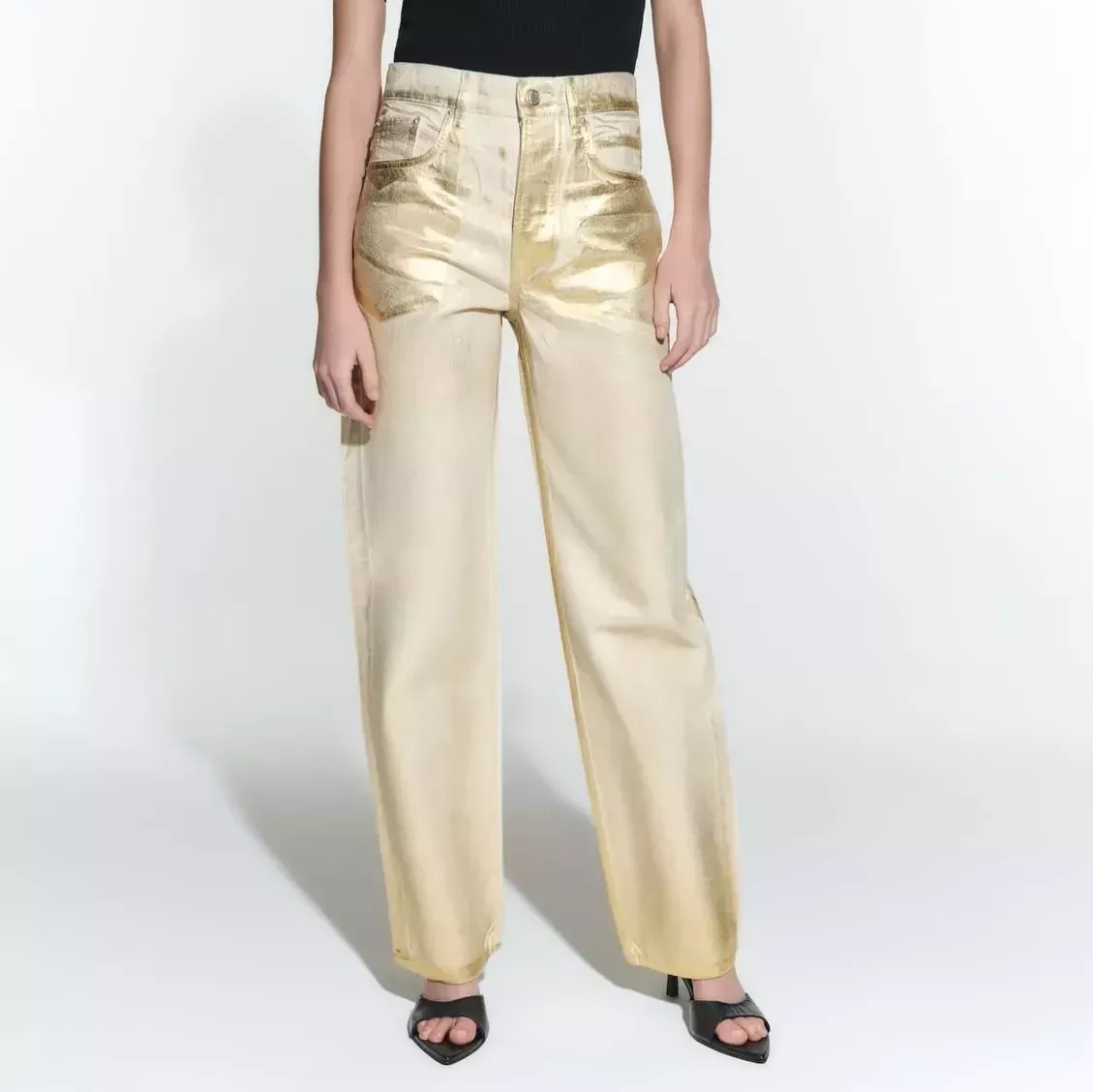 These jeans are an all-season staple, ideal for various occasions. They’re perfect for a casual day out, an evening with friends, or even for making a statement at a semi-formal event. The unique gold paint-coat adds a touch of glamour, making them versatile for both day and night wear.