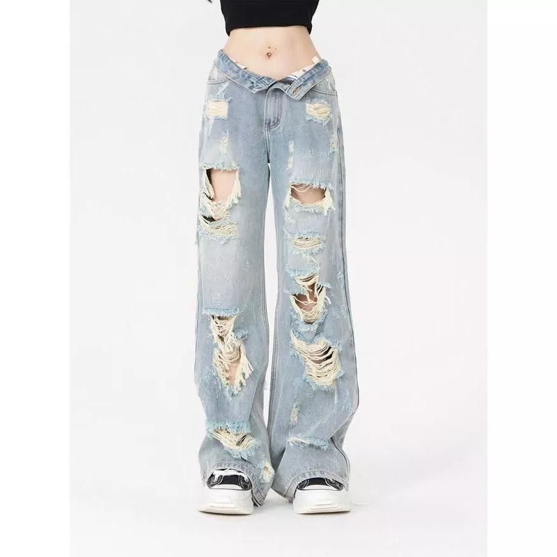 Our jeans boast a range of features that combine style and convenience. The high-waist design complements your figure, while the loose, wide-leg style ensures comfort all day long. Made from durable polyester fabric, these jeans are designed to last. The light wash gives them a timeless appeal, and the unique stripe fabric adds a touch of sophistication. But it’s the subtle details like buttons, pockets, and decorative holes that truly make these jeans stand out.
