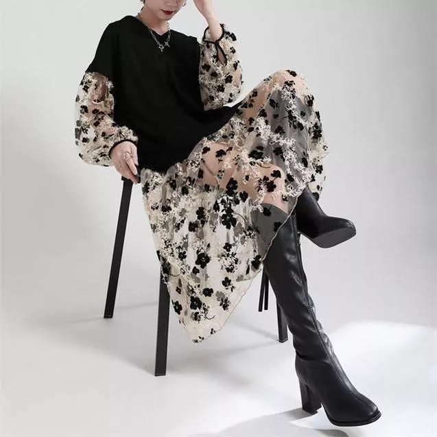Boho Chic Floral Midi Dress – Sweetheart Neckline, Long Puff Sleeves, Elegant Lace Detail