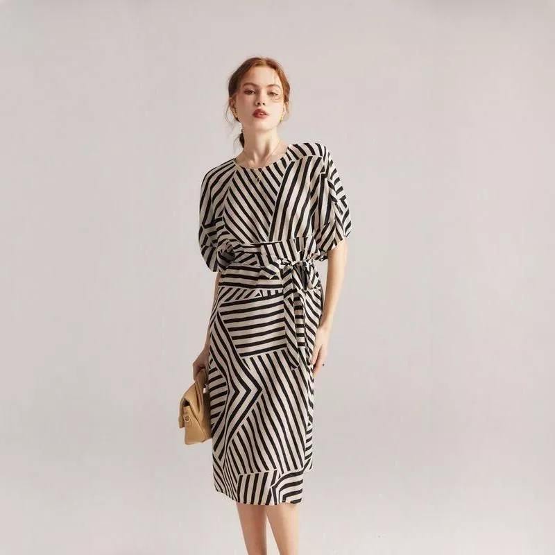 Elegant Striped Silk Mid-Calf Dress with Batwing Sleeves