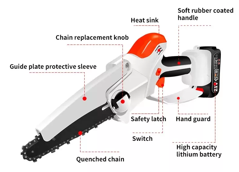 Safety as a Priority: Your safety is our top concern. This cordless chainsaw features a triple safety mechanism: a security lock to prevent accidental activation, a blade guard for added protection, and a handle guard that separates your hand from the chain, ensuring complete safety during use.
