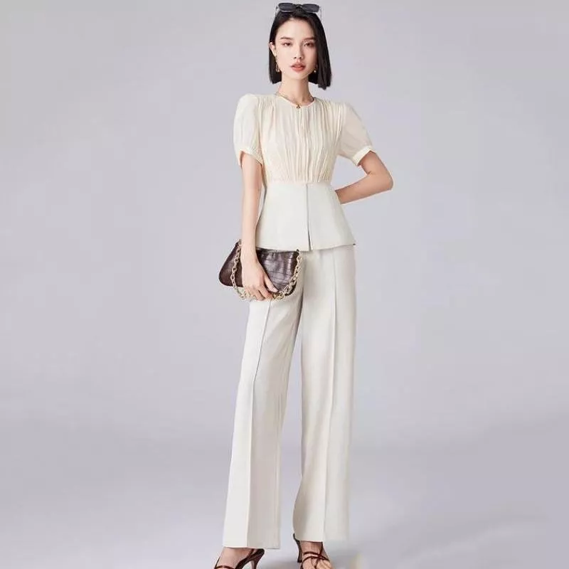 Elegant Two-Piece Office Suit with Long Sleeve Top and Wide-Leg Pants