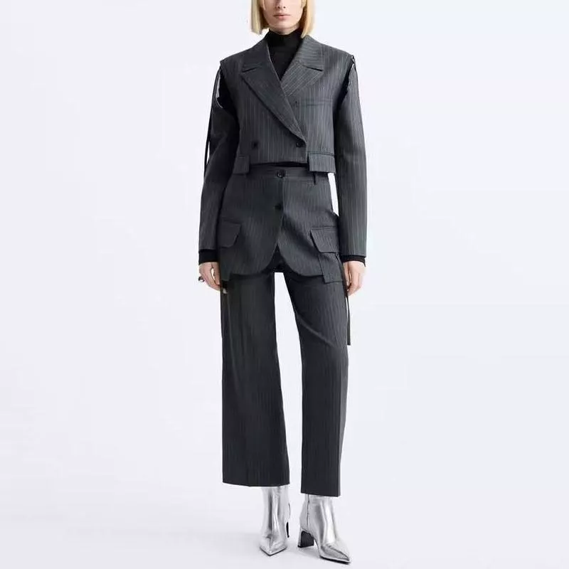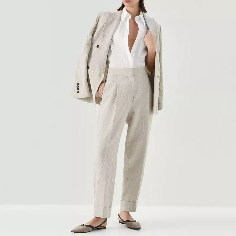 Elegant Beaded Linen Suit Set – Women’s Double Breasted Blazer and Straight Trousers