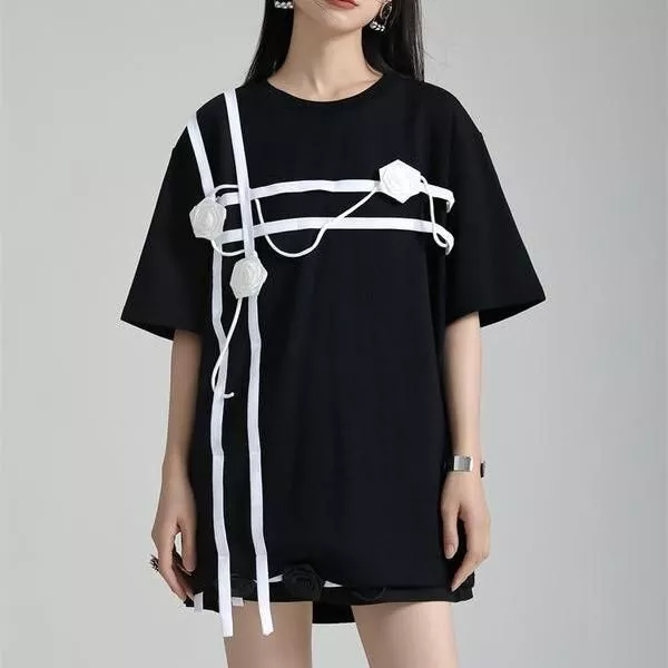 Chic Black & White Floral Half-Sleeve Casual T-Shirt