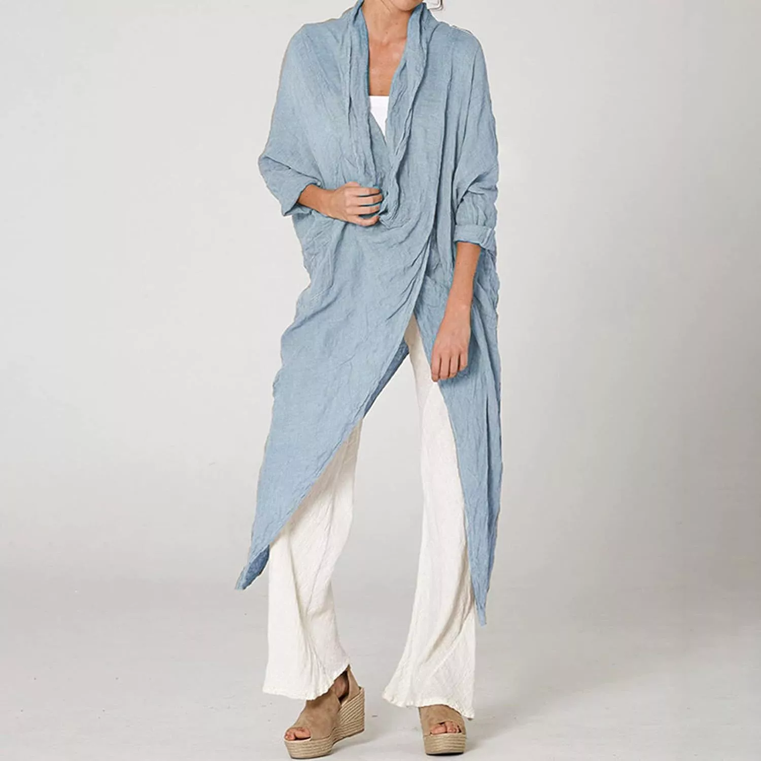 This stylish long shirt is a versatile addition to your wardrobe. Its non-stretch fabric ensures a slim fit, making it ideal for casual outings, holidays, beach days, or parties. The solid pattern exudes timeless elegance, while the cowl neck adds a modern twist.